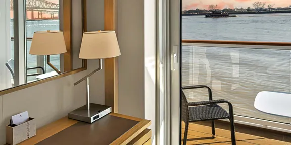 - River-view stateroom with floor-to-ceiling sliding glass door opening to full-size veranda